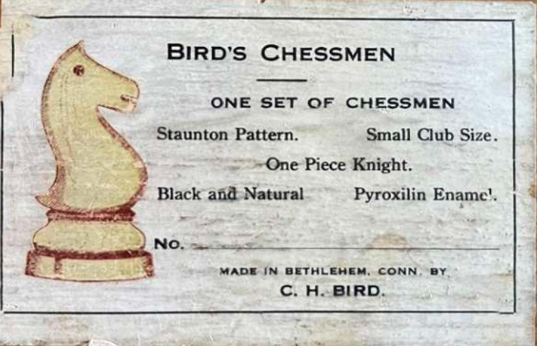 After the New Haven phase, Bird’s chess enterprise moved to Bethlehem, Litchfield County, Connecticut, where it seems to have settled into a later and somewhat more standardized product line. Camaratta notes that labels were altered to reflect the move from New Haven to Bethlehem. By 1932, Bird’s advertised range included at least two sizes: a Small Club Size with a 3.6-inch king and a College Size with a 3.0-inch king. A surviving College Size box described by Chess Antiques is stamped “Made in U.S.A., Bird’s Chessmen, College Size, Black and Natural, Pyralin Enamel Finish, Loaded and Felted,” which gives us a near-factory description of Bird’s mature product. This later phase shows Bird refining his line into recognizable catalog offerings while preserving the distinct Bird knight and Bird finish.